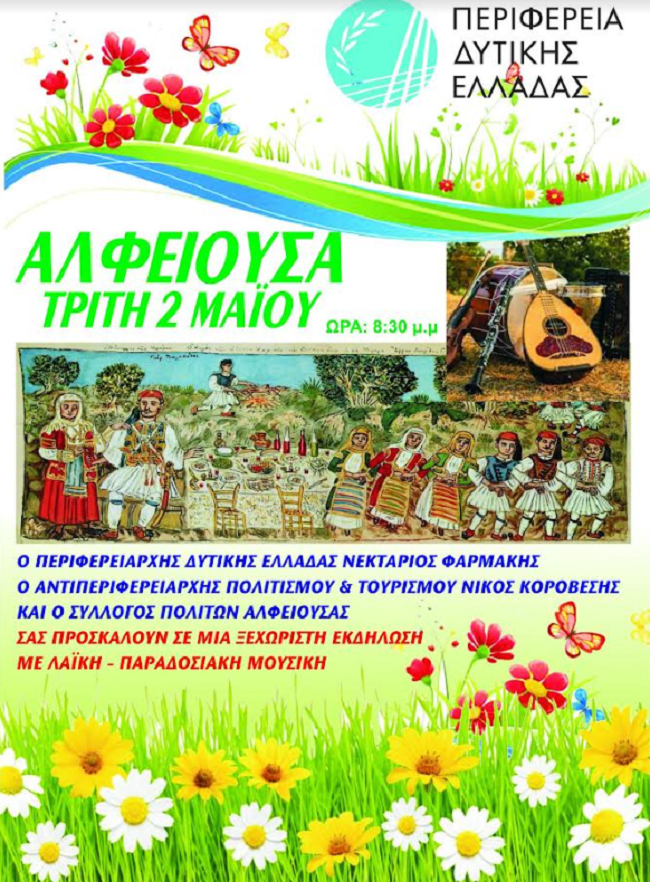 Την Τρίτη 2 Μαίου στην κεντρική πλατεία του χωριού από τον Σύλλογο Πολιτών Αλφειούσας με την στήριξη της Περιφέρειας Δυτ. Ελλάδας