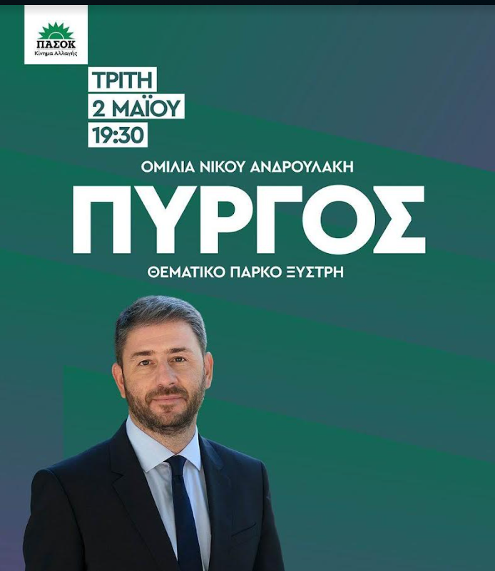 Την Τρίτη 2 Μαΐου θα πραγματοποιηθεί η επίσκεψη του προέδρου του «ΠΑΣΟΚ – Κίνημα Αλλαγής» Νίκου Ανδρουλάκη στην Ηλείας, η οποία θα ολοκληρωθεί με κεντρική ομιλία, η οποία έχει προγραμματιστεί για τις 19:30, στο Θεματικό Πάρκο Ξυστρή στον Πύργο.