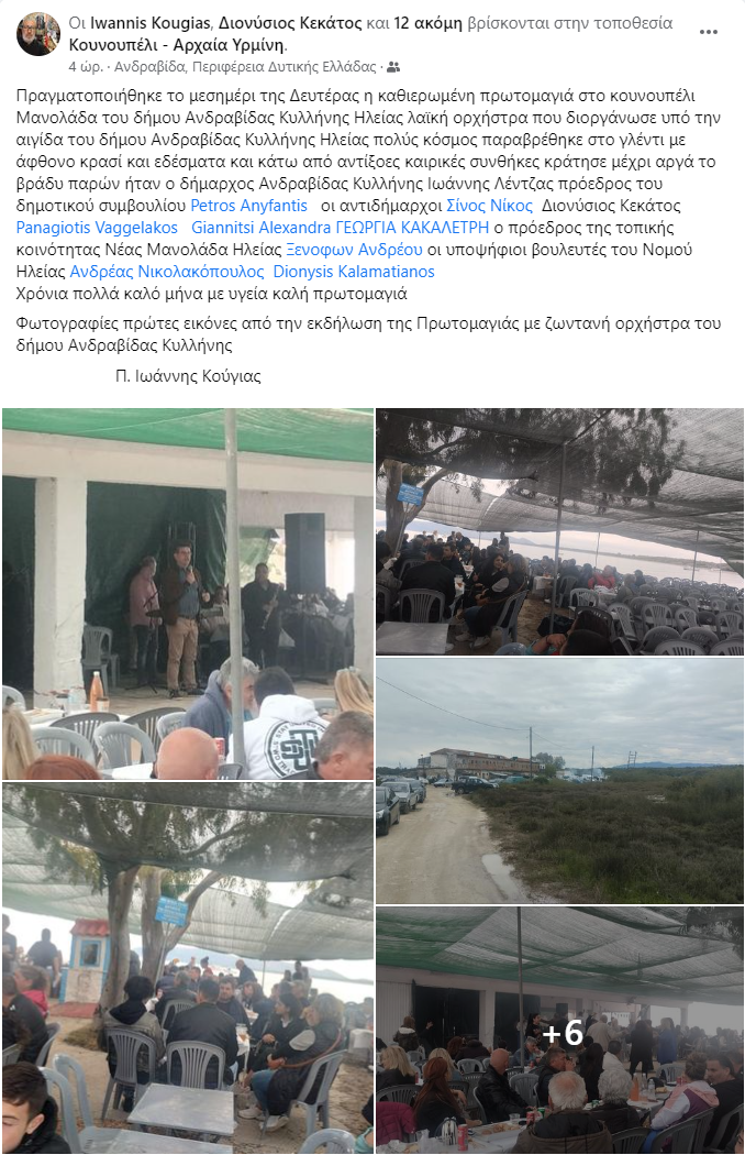 Παρά τον άστατο καιρό πραγματοποιήθηκε σήμερα το μεσημέρι η καθιερωμένη εορτή της πρωτομαγιάς στο Κουνουπέλι Μανολάδα του δήμου Ανδραβίδας Κυλλήνης με λαϊκή ορχήστρα, με άφθονο κρασί και εδέσματα.