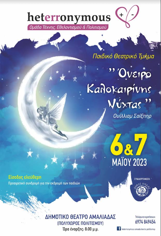 «Το Παιδικό Τμήμα Θεάτρου των “Heterronymous” στην Αμαλιάδα δημιουργήθηκε με τη φιλοδοξία μιας ολοκληρωμένης παράστασης. Έτσι φτάσαμε στο “Όνειρο Καλοκαιρινής Νύχτας”. Δύσκολο εγχείρημα και μεγάλο ρίσκο. Όμως αν έχεις να κάνεις με τέτοια Ομαδάρα όλα γίνονται…. υπέροχα! Δεν περιμέναμε ποτέ ότι και εμείς θα το διασκεδάζαμε τόσο.