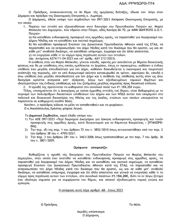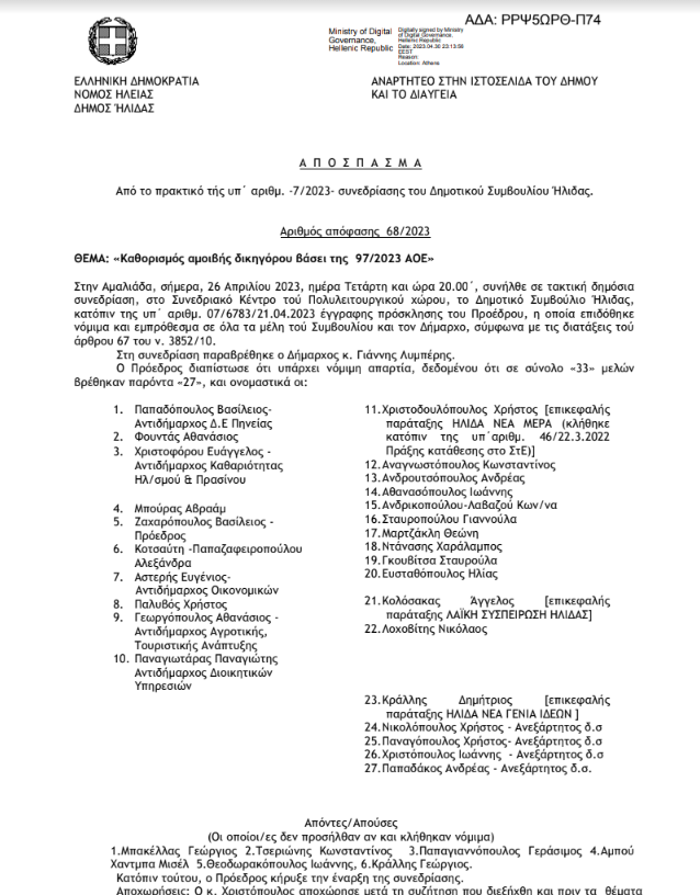 Από ενδιαφέρον αλλά και περιέργεια θα ήθελα μια τοποθέτηση του Δικηγορικού Συλλόγου Αμαλιάδας στο εξής ερώτημα : Δεν διαθέτει ο Δήμος Ήλιδας άξιους νομικούς για να αναλάβουν την εκπροσώπησή του σε ένα τόσο σοβαρό θέμα όπως το κάμπινγκ και τρέχει ο κ Λυμπέρης να προσλάβει δικηγόρους από άλλους νομούς; Σας παρουσιάζω δε και την ανάθεση που κάνατε σε δικηγόρο της Πάτρας ώστε να το μάθουν οι πολίτες και να σας κρίνουν κ. Λυμπέρη.