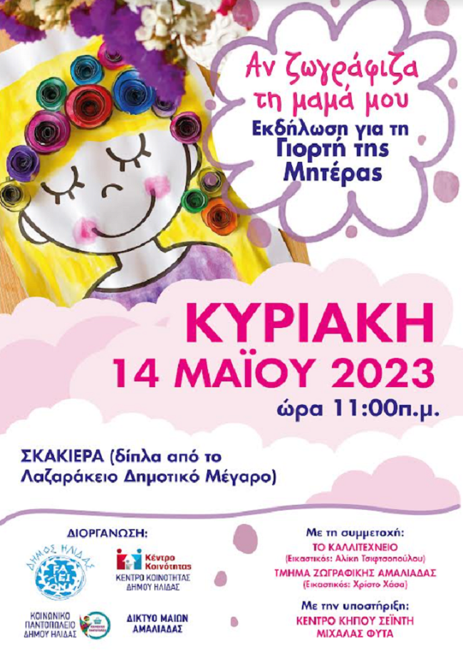 Την εκδήλωση διοργανώνουν ο Δήμος Ήλιδας, το Κέντρο Κοινότητας του Δήμου Ήλιδας, το Κοινωνικό Παντοπωλείο του Δήμου Ήλιδας και το Δίκτυο Μαιών Αμαλιάδας. Συμμετέχουν τα καλλιτεχνικά εργαστήρια της Αμαλιάδας ΤΟ ΚΑΛΛΙΤΕΧΝΕΙΟ και το ΤΜΗΜΑ ΖΩΓΡΑΦΙΚΗΣ ΑΜΑΛΙΑΔΑΣ, με μητέρες και παιδιά να αναλαμβάνουν ρόλο ζωγράφου με εικαστικές δημιουργίες δίνοντας το δικό τους μήνυμα για τη γιορτή της μητέρας, ενώ παράλληλα θα γίνει και αποκατάσταση της τοιχογραφίας που έχει γίνει στη Σκακιέρα με θέμα την ευαισθητοποίηση και την πρόληψη για τον καρκίνο του μαστού.