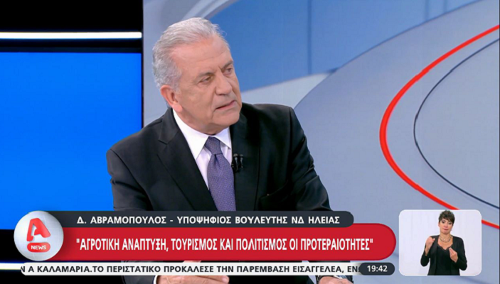 Ο πρ. Ευρωπαίος Επίτροπος, Υπουργός Εξωτερικών και υποψήφιος βουλευτής της Νέας Δημοκρατίας στην Ηλεία, Δ. Αβραμόπουλος, παραχώρησε χθες συνέντευξη στο κεντρικό δελτίο ειδήσεων του Alpha και τον Αντώνη Σρόιτερ για τα μεγάλα ζητήματα της Ηλείας και τις αναξιοποίητες δυνατότητες του Νομού.