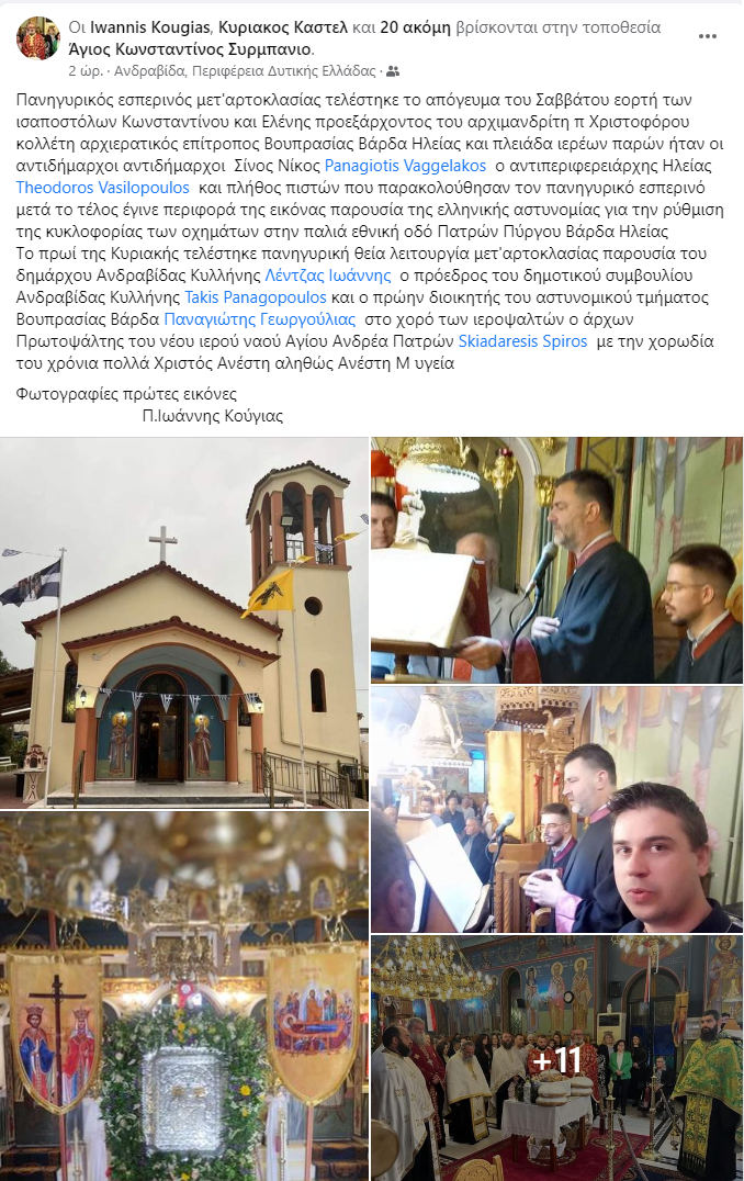 Πανηγυρικός εσπερινός μετ’αρτοκλασίας τελέστηκε το απόγευμα του Σαββάτου εορτή των ισαποστόλων Κωνσταντίνου και Ελένης προεξάρχοντος του αρχιμανδρίτη π Χριστοφόρου κολλέτη αρχιερατικός επίτροπος Βουπρασίας Βάρδα Ηλείας και πλειάδα ιερέων.