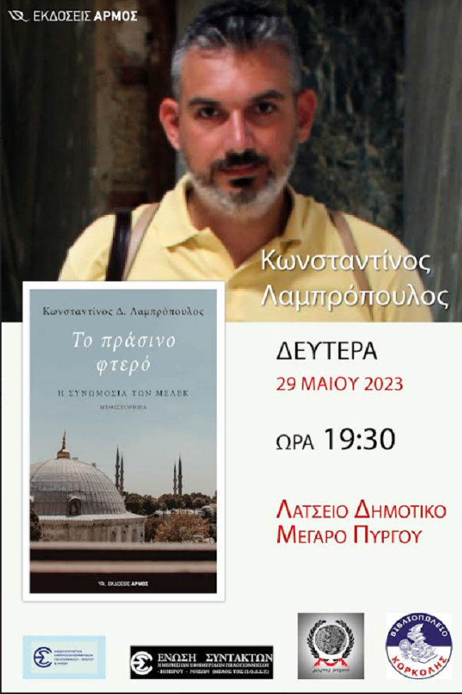 Υπό την αιγίδα του Δήμου Πύργου, παρουσιάζεται το νέο βιβλίο του δημοσιογράφου Κωνσταντίνου Λαμπρόπουλου με τίτλο «Το πράσινο φτερό-Η συνωμοσία των Μελέκ», τη Δευτέρα 29 Μαΐου και ώρα 19.30 στο Λάτσειο Δημοτικό Μέγαρο (αίθουσα συνεδριάσεων Δ.Σ. ). Η εκδήλωση διοργανώνεται από το βιβλιοπωλείο «Κορκολής» και τις εκδόσεις Αρμός, με τη στήριξη της Ένωσης Συντακτών Πελοποννήσου, Ηπείρου και Νήσων (ΕΣΗΕΠΗΝ).