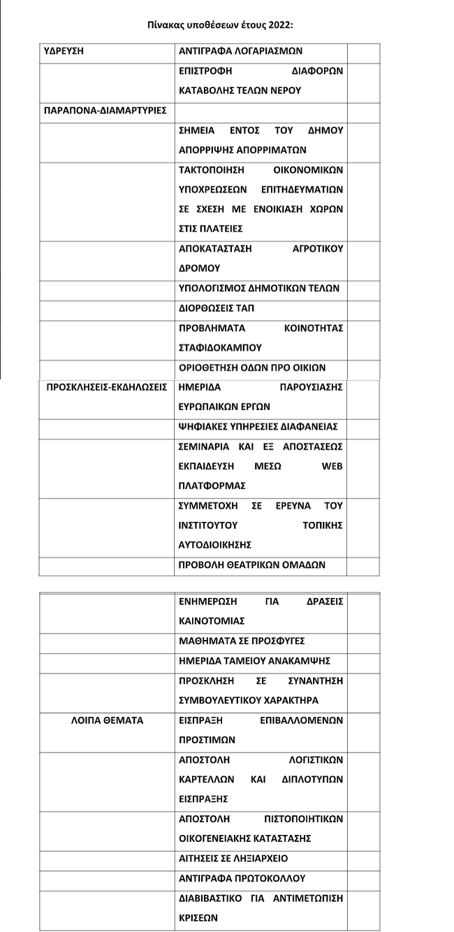 Στην παρούσα έκθεση παρουσιάζονται τα θέματα-υποθέσεις που μας απασχόλησαν το έτος 2022. Στην ετήσια έκθεση, περιλαμβάνονται προτάσεις για τη βελτίωση της διοίκησης και των σχέσεών της με τους δημότες.