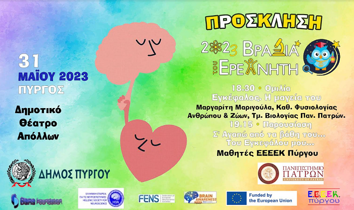 Η καθηγήτρια του Πανεπιστημίου Πατρών Μαριγούλα Μαργαρίτη, στο πλαίσιο της εκστρατείας για την βραδιά του ερευνητή, θα συνεργαστεί με το ΕΕΕΕΚ Πύργου και θα παρουσιάσει σε ομιλία της το θέμα «Εγκέφαλος: Η μαγεία του.