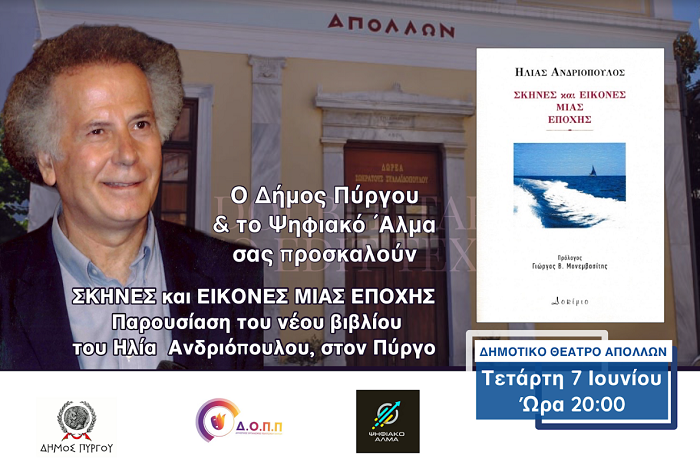 Ο Δήμος Πύργου, ο Δημοτικός Οργανισμός Πολιτισμού και η Κοινωνική Συνεταιριστική Επιχείρηση “Ψηφιακό Άλμα” , παρουσιάζουν το νέο βιβλίο του Ηλείου μουσικοσυνθέτη Ηλία Ανδριόπουλου: «Σκηνές και Εικόνες μιας Εποχής».