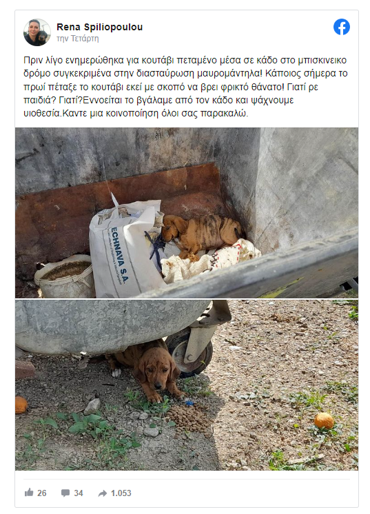 «Πριν λίγο ενημερώθηκα για κουτάβι πεταμένο μέσα σε κάδο στο μπισκινέικο δρόμο, συγκεκριμένα στη διασταύρωση Μαυρομάντηλα! Κάποιος σήμερα το πρωί πέταξε το κουτάβι εκεί με σκοπό να βρει φρικτό θάνατο! Γιατί ρε παιδιά; Γιατί; Εννοείται το βγάλαμε από τον κάδο και ψάχνουμε υιοθεσία», έγραψε στην ανάρτηση η Ρένα Σπηλιοπούλου.