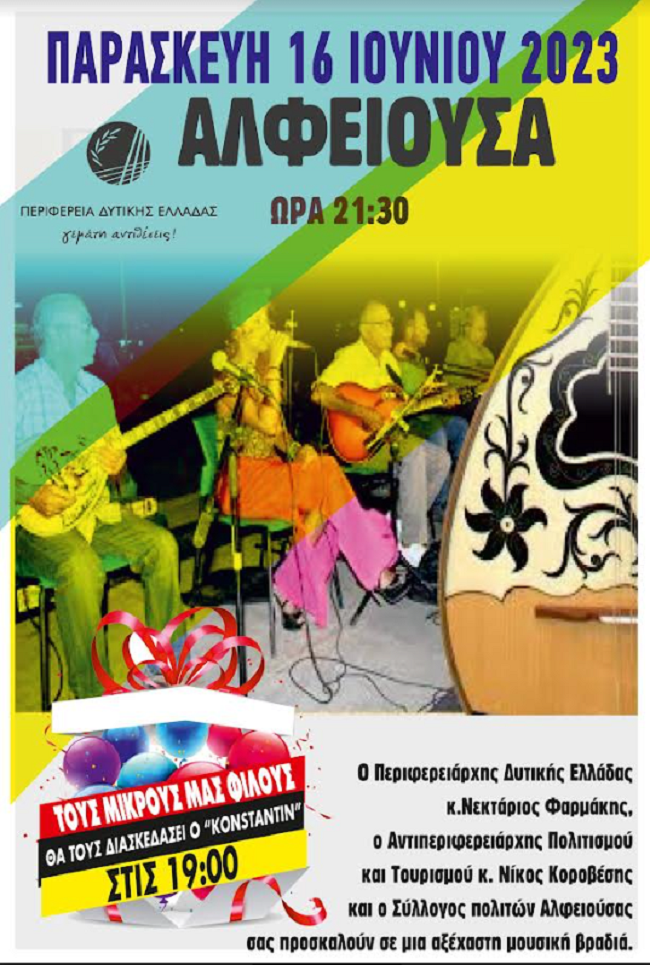 Μια αξέχαστη μουσική βραδιά διοργανώνει την Παρασκευή 16 Ιουνίου στις 9.30 το βράδυ, στην πλατεία της Αλφειούσας, η Περιφέρεια Δυτικής Ελλάδας και το τμήμα Πολιτισμού, μαζί με τον Σύλλογο Πολιτών Αλφειούσας. Στόχος να ξαναζωντανέψει το χωριό μέσα από μια ξεχωριστή γιορτή, με λαϊκή και παραδοσιακή μουσική, άφθονη μπύρα και εδέσματα και προπαντός με ελεύθερη είσοδο για το κοινό. Νωρίτερα, στις 7 το απόγευμα, με αφορμή την λήξη της σχολικής χρονιάς, ο Σύλλογος Πολιτών Αλφειούσας έχει προσκαλέσει τον μάγο Konstadin για να διασκεδάσει τα παιδιά, αποχαιρετώντας με τον τρόπο αυτό τους τελειόφοιτους μαθητές του δημοτικού που από το Σεπτέμβρη θα φοιτήσουν πλέον στο γυμνάσιο.