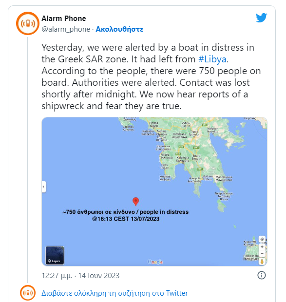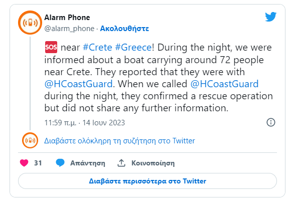 Όπως σημειώνει το dikaiologitika.gr το αλιευτικό είχε ξεκινήσει από το Τομπρούκ της Λιβύης και εντοπίστηκε χθες το μεσημέρι από τη Frontex, αλλά και παραπλέοντα σκάφη, χωρίς να ζητάει βοήθεια. Σημειώνεται πως το αρχικό «SOS» για το ναυάγιο το εξέπεμψε η ΜΚΟ Alarm Phone, κάνοντας λόγο για 72 επιβαίνοντες στο σκάφος.