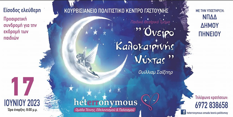 Σ’ ένα “Όνειρο Καλοκαιρινής Νύχτας”, την ωδή του Σαίξπηρ στον έρωτα. Όπου νεράιδες και ξωτικά, σε ένα δάσος γεμάτο εκπλήξεις, μπερδεύονται με 2 ζευγάρια που κυνηγούν και κυνηγιούνται και έναν πρόχειροφτιαγμένο θίασο από μάστορες, καταλήγοντας σε ένα βασιλικό γάμο! Ανάμεσα στο θρόισμα των φύλλων, τα νανουρίσματα των πουλιών, το γκάρισμα του γαϊδάρου, τη μεταμόρφωση της αλήθειας της στιγμής και την άλλη αλήθεια, της φαντασίας, τα παιδιά γίνονται η παραμυθένια φωνή του δάσους. Ραντεβού λοιπόν στις 17 Ιουνίου, στο Κουρβισιάνειο Πολιτιστικό Κέντρο Γαστούνης, στις 8.00 μ.μ. Ευχή μας το να γίνουμε όλοι μία μεγάλη παρέα που θα συμμετέχει ενεργά σε οτιδήποτε πάει τα όνειρά μας ένα βήμα μπροστά».