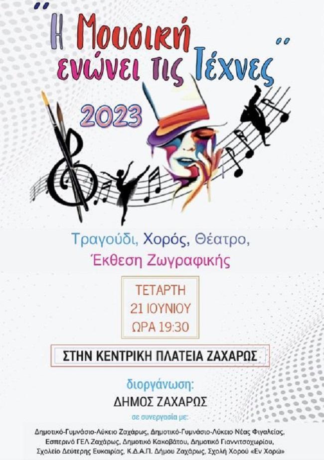 Με αφορμή την Ευρωπαϊκή Ημέρα της Μουσικής, σας προσκαλούμε για δεύτερη συνεχή χρόνια, την Τετάρτη 21 Ιουνίου 2023 και ώρα 19:30 στην κεντρική πλατεία Ζαχάρως, στην εκδήλωση βράβευσης των δράσεων των σχολικών μονάδων του δήμου.