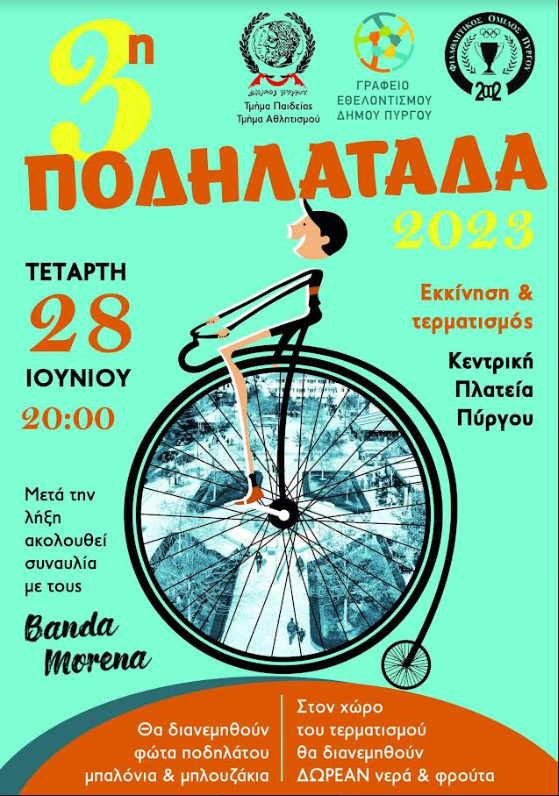 Ο Δήμος Πύργου σε συνεργασία με το τμήμα Παιδείας, το τμήμα Αθλητισμού, το Γραφείο Εθελοντισμού και τον Φιλαθλητικό Όμιλο Πύργου, διοργανώνουν την 3 η Ποδηλατάδα την Τετάρτη 28 Ιουνίου και ώρα 20.00 με σημείο εκκίνησης και τερματισμού την κεντρική πλατεία της πόλης, όπου και θα πραγματοποιηθεί συναυλία με το δημοφιλές συγκρότημα Banda Morena μετά το τέλος της διαδρομής.