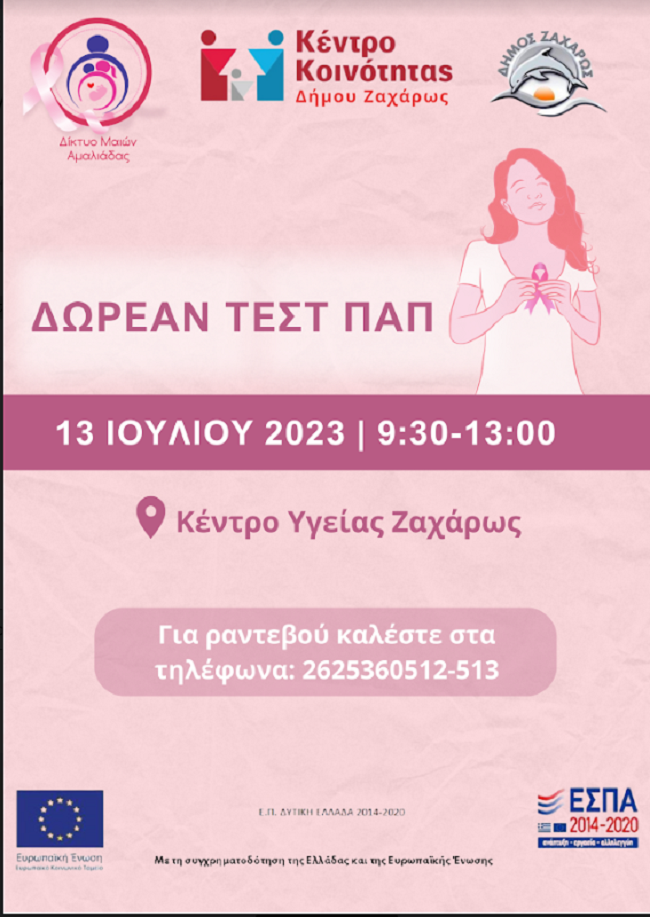 Ο Δήμος Ζαχάρως μέσω του Κέντρου Κοινότητας και της Κοινωφελούς Επιχείρησης, σε συνεργασία με το Δίκτυο Μαιών της Νοσηλευτικής Μονάδας Αμαλιάδας και το Κέντρο Υγείας Ζαχάρως, θα πραγματοποιήσει ΔΩΡΕΑΝ προληπτικό έλεγχο (τεστ ΠΑΠ) σε γυναίκες του Δήμου, την Πέμπτη 13 Ιουλίου 2023 στο χώρο του Κέντρου Υγείας κατά τις ώρες 9:30-13:00.