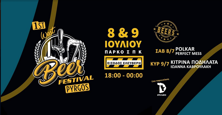 Στις 8 και 9 Ιουλίου στο «Πάρκο ΣΠΚ» Πύργου Με έντονο ενδιαφέρον αναμένεται το 1 ο WEST BEER FESTIVAL, που θα διεξαχθεί στις 8 και 9 Ιουλίου στο Πάρκο ΣΠΚ Πύργου. Μια γιορτή που στοχεύει να φιλοξενήσει 1000 επισκέπτες κάθε μέρα λειτουργία της, να προσελκύσει επισκέπτες από γειτονικούς νομούς, να φιλοξενήσει σε ξενοδοχεία και την υπόλοιπη τοπική αγορά εκατοντάδες καταναλωτές. – Χώρος διεξαγωγής είναι το Πάρκο Σ.Π.Κ. Πύργου.