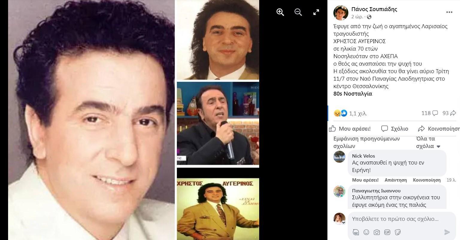 «Έφυγε από τη ζωή ο αγαπημένος Λαρισαίος τραγουδιστής Χρήστος Αυγερινός σε ηλικία 70 ετών. Νοσηλευόταν στο ΑΧΕΠΑ. Ο Θεός ας αναπαύσει την ψυχή του. Η εξόδιος ακολουθία του θα γίνει αύριο Τρίτη 11/7 στον Ιερό Ναό Παναγίας Λαοδηγήτριας στο κέντρο της Θεσσαλονίκης».