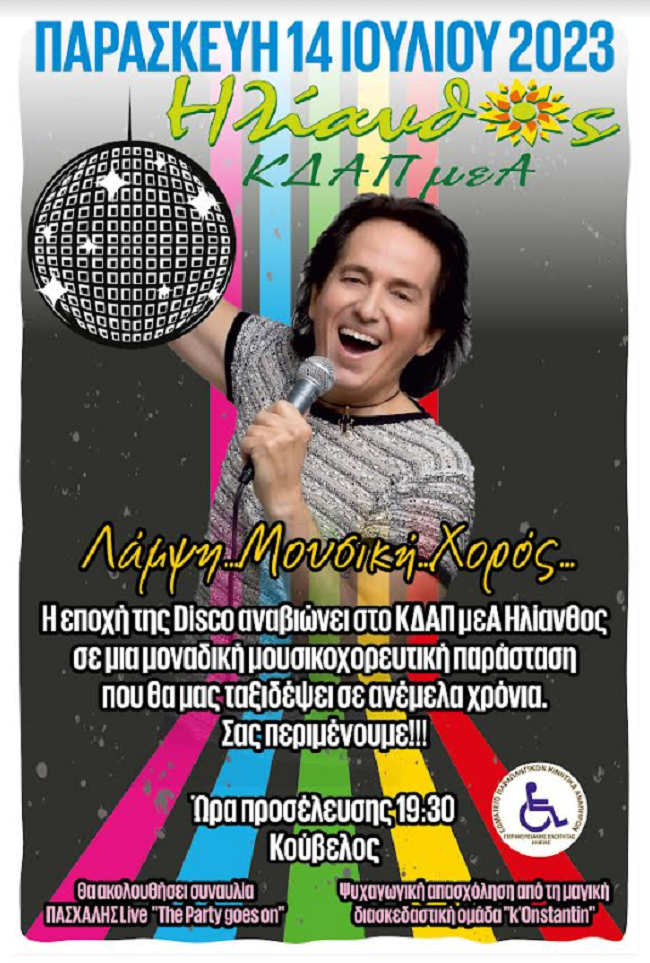 Η εποχή της Disco αναβιώνει στο ΚΔΑΠ μεΑ Ηλίανθος σε μια μοναδική μουσικοχορευτική παράσταση που θα μας ταξιδέψει σε ανέμελα χρόνια.