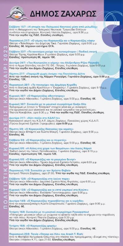 Ένα πλούσιο πολιτιστικό πρόγραμμα με συναυλίες, θεατρικές παραστάσεις για παιδιά και ενήλικες, παραστάσεις Καραγκιόζη και σινεμά θα έχουν την ευκαιρία να απολαύσουν οι δημότες και οι επισκέπτες του Δήμου Ζαχάρως το φετινό καλοκαίρι. Η μπάντα του Πολεμικού Ναυτικού, η παιδική σκηνή του Θεάτρου Τέχνης Καρόλου Κουν και η παιδική σκηνή της Κάρμεν Ρουγγέρη, το ΔΗ.ΠΕ.ΘΕ. Πάτρας, η θεατρική ομάδα Κρεστένων, ο Χρήστος Θηβαίος, οι Gadjo Dilo, οι Passepartout κ.α. θα μας χαρίσουν αξέχαστες στιγμές.