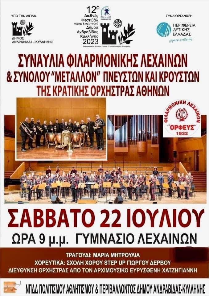 Μια ξεχωριστή συναυλία πραγματοποιείται αύριο Σάββατο 22 Ιουλίου στις 21:00 στο πλαίσιο του 12ου Διεθνούς Φεστιβάλ Ανδραβίδας-Κυλλήνης. Στον χώρο του Γυμνασίου Λεχαινών, η Φιλαρμονική Λεχαινών μαζί με το Σύνολο «Μέταλλον» Πνευστών και Κρουστών της Κρατικής Ορχήστρας Αθηνών θα καθηλώσουν το κοινό μαζί με την Μαρία Μητρούλια στο τραγούδι και χορευτικά από την Σχολή Χορού Step Up του Γιώργου Δέρβου.