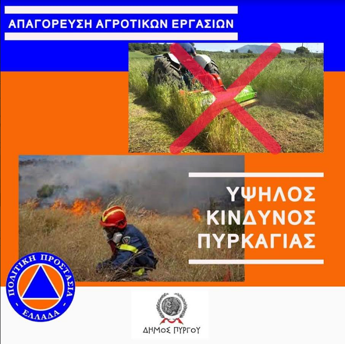 Τέλος επισημαίνεται η αυξημένη προσοχή των κατοίκων – ο Δημος βρίσκεται σε κατάσταση επικινδυνότητας 4- με στόχο την προστασία του περιβάλλοντος και των καλλιεργήσιμων εκτάσεων στο συγκεκριμένο χρονικό διάστημα. Ο δημος Πυργου με όλες τις υπηρεσίες του (Οχήματα Πολιτικής Προστασίας, Δημοτική Αστυνομία κλπ) χτενίζουν με περιπολίες, όλο το 24ωρο τις αγροτικές και ημιορεινές περιοχές του Δήμου.