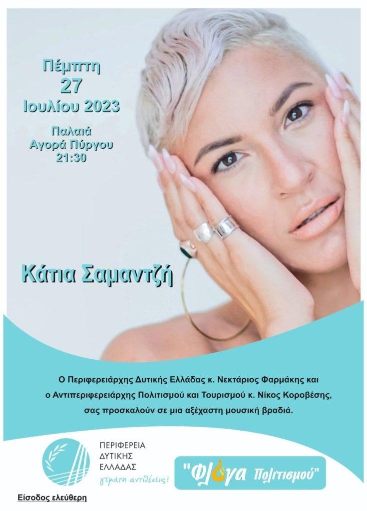 Την δημοφιλή – κυρίως στο νεανικό κοινό- τραγουδίστρια, γνωστή από τη συμμετοχή της στο τηλεοπτικό μουσικό σόου «The Voice» , και πρώην τραγουδίστρια των C:REAL Κάτια Σαμαντζή, φιλοξενεί η πόλη του Πύργου το βράδυ της Πέμπτης 27 Ιουλίου στις 9.30 μμ, σε μια μοναδική συναυλία στην Παλαιά Αγορά Πύργου που διοργανώνει ο τομέας Πολιτισμού της Περιφέρειας Δυτικής Ελλάδας.