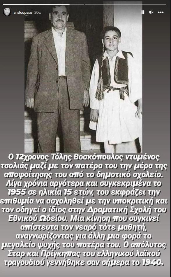 “Ο 12χρονος Τόλης Βοσκόπουλος ντυμένος τσολιάς μαζί με τον πατέρα του τη μέρα της αποφοίτησής του από το δημοτικό σχολείο. Λίγα χρόνια αργότερα και συγκεκριμένα το 1955 σε ηλικία 15 ετών, του εκφράζει την επιθυμία να ασχοληθεί με την υποκριτική και τον οδηγεί ο ίδιος στη Δραματική Σχολή του Εθνικού Ωδείου. Μια κίνηση που συγκινεί απίστευτα τον νεαρό τότε μαθητή, αναγνωρίζοντας για άλλη μια φορά το μεγαλείο ψυχής του πατέρα του. Ο απόλυτος σταρ και πρίγκιπας του ελληνικού λαϊκού τραγουδιού σαν σήμερα το 1940”.