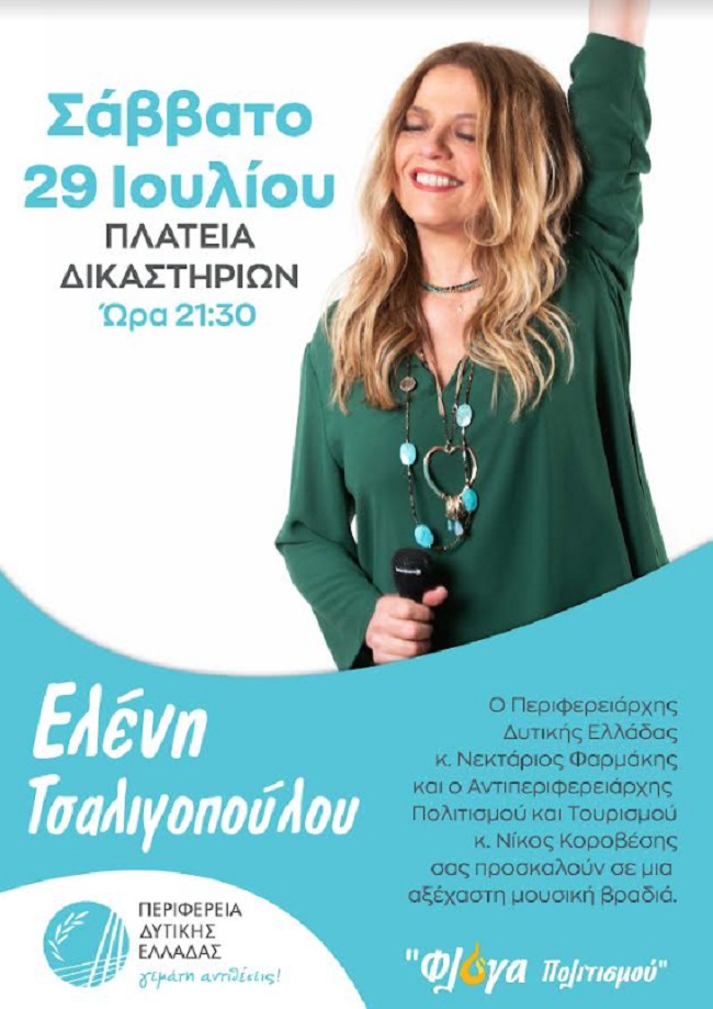 Μια ξεχωριστή μουσική βραδιά με τραγούδια λαϊκά, ρεμπέτικα, νησιώτικα και παραδοσιακά, τραγούδια σπουδαίων Ελλήνων συνθετών κλασικά και νεότερα, όλα εκείνα που αγαπήσαμε με την φωνή της Ελένης Τσαλιγοπούλου, διοργανώνει το Σάββατο 29 Ιουλίου στις 9.30 το βράδυ στην πλατεία δικαστηρίων Πύργου, ο τομέας Πολιτισμού της Περιφέρειας Δυτικής Ελλάδας στο πλαίσιο του προγράμματος “ Φλόγα Πολιτισμού 2023”.