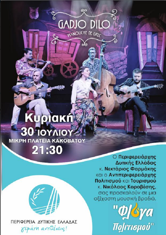 Η αγαπημένη μπάντα Gadjo Dilo, έρχεται για μια υπέροχη παράσταση, με gypsy jazz διάθεση & άρωμα Ελλάδας, το βράδυ της Κυριακής 30 Ιουλίου, στις 9.30 στην μικρή πλατεία Κακοβάτου. Την συναυλία διοργανώνει ο τομέας Πολιτισμού της Περιφέρειας Δυτ. Ελλάδας στο πλαίσιο των καλοκαιρινών πολιτιστικών του εκδηλώσεων και όπως τονίζει ο Αντιπεριφερειάρχης Πολιτισμού και Τουρισμού Ν. Κοροβέσης “Την Κυριακή το βράδυ ανανεώνουμε το ραντεβού μας με την Φλόγα Πολιτισμού αυτή τη φορά στον Κακόβατο με τους Gadjo Dilo με ξεχωριστούς και συναρπαστικούς ήχους , μια βραδιά γεμάτη κέφι και τραγούδια”.
