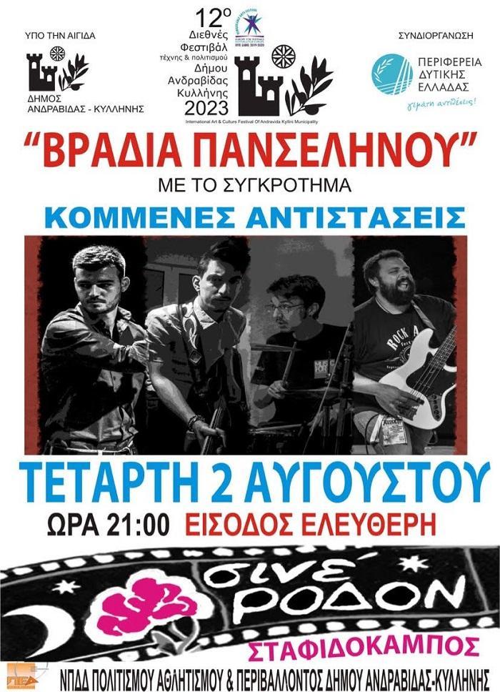 Οι «Κομμένες Αντιστάσεις είναι οι: Κώστας Βικάτος στα φωνητικά, Αγοργιανίτης Λουκάς στην ηλεκτρική κιθάρα, Ντοροβάτας Βασίλης στα τύμπανα και Κασαπίδης Γιώργος στο μπάσο. Η εκδήλωση τελεί υπό την αιγίδα του Δήμου Ανδραβίδας-Κυλλήνης και του ΝΠΔΔ Πολιτισμού, Αθλητισμού και Περιβάλλοντος με την συνδιοργάνωσητης Περιφέρειας Δυτικής Ελλάδας. Ώρα έναρξης: 21:00 Είσοδος ελεύθερη