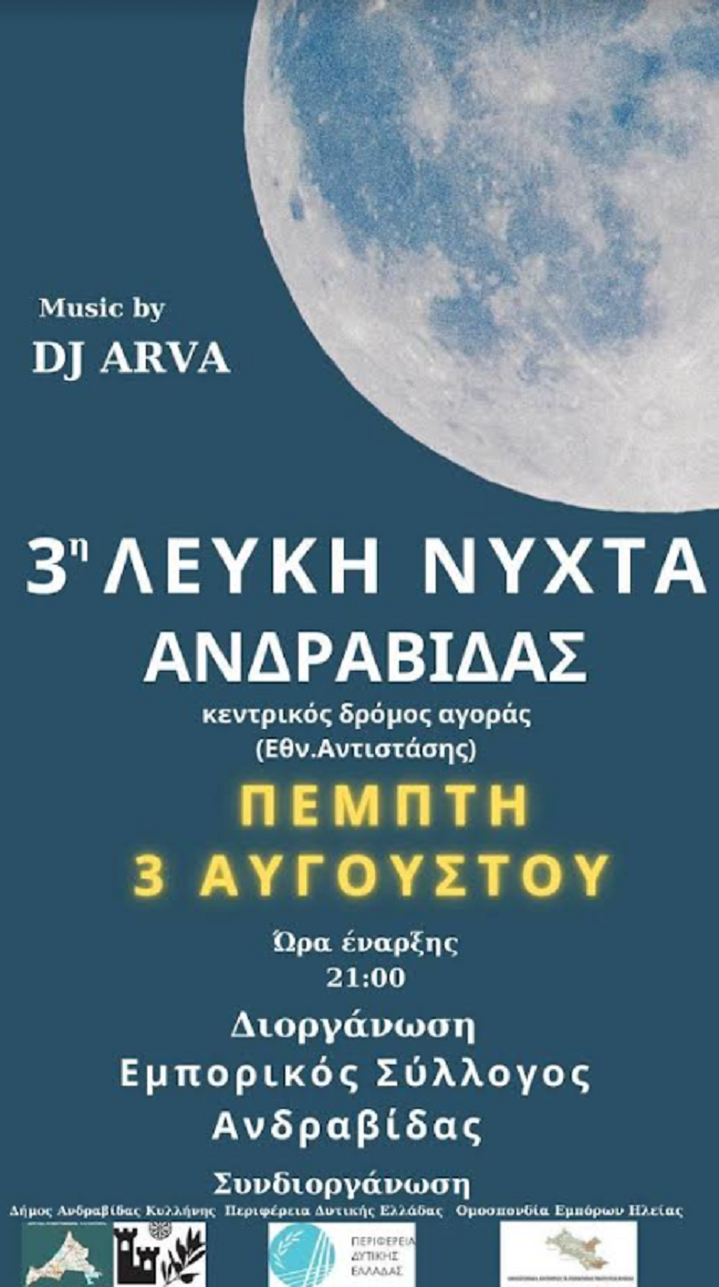 Την 3η ΛΕΥΚΗ ΝΥΧΤΑ στην αγορά της Ανδραβίδας, μια μεγάλη γιορτή που έχει πλέον γίνει θεσμός για τα εμπορικά καταστήματα και όλη την πόλη, διοργανώνει την Πέμπτη 3 Αυγούστου, ο Εμπορικός Σύλλογος Ανδραβίδας με συνδιοργανωτές την Περιφέρεια Δυτικής Ελλάδας, το δήμο Ανδραβίδας- Κυλλήνης και την Ομοσπονδία Εμπορικών Συλλόγων Ηλείας. Οι επισκέπτες θα έχουν την δυνατότητα να απολαύσουν μια υπέροχη βραδιά στον κεντρικό δρόμο της αγοράς της Ανδραβίδας γεμάτη εκπλήξεις, χορό , παιδικά event καλή μουσική, δροσιστικά ποτά, πολλά κεράσματα και φυσικά μεγάλες εκπτώσεις!