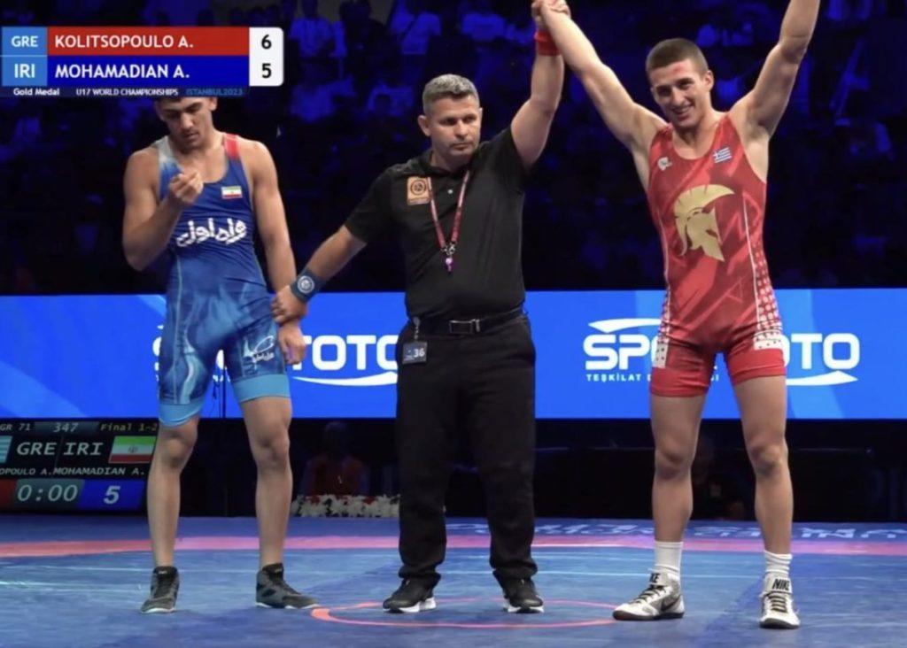 Ο Αρίων Κολιτσόπουλος, είναι πρωταθλητής κόσμου. Είναι από χθες, ο καλύτερος στην Ελληνορωμαϊκή Πάλη, στην κατηγορία των κιλών, στην ηλικία των 17 ετών. Μετά από ένα πολύ μεγάλο παιχνίδι, επικράτησε με 6-5 του Ιρανού Μοχαμάντιαν, χάρη σε ανατροπή, με μια τρομερή κίνηση η οποία του απέφερε δυο βαθμούς, από εκεί όπου βρισκόταν σε δύσκολη θέση και πίσω στο σκορ με 5- 4, σαράντα δεύτερα πριν το φινάλε.