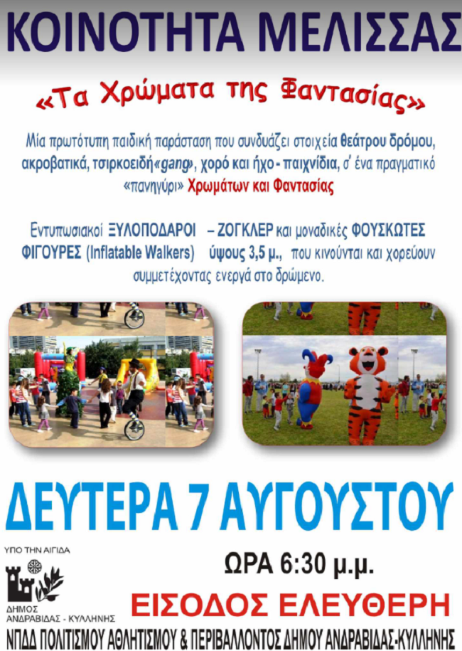 Η κοινότητα Μέλισσας σε συνεργασία με το ΝΠΔΔ Πολιτισμού Αθλητισμού & Περιβάλλοντος του Δήμου Ανδραβίδας Κυλλήνης σας προσκαλούν στην πλατεία της Μέλισσας τη Δευτέρα στις 6:30 το απόγευμα, σε μια πρότοτυπη θεατρική παράσταση για τους μικρούς μας φίλους,σ ένα ταξίδι γεμάτο χρώματα.