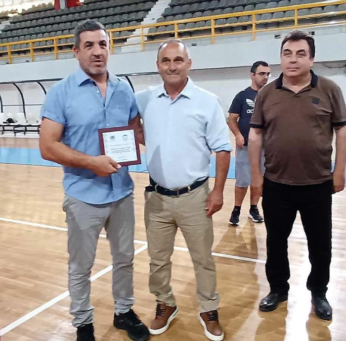 Ο Αντιδήμαρχος Αθλητισμού Γιάννης Αργυρόπουλος τίμησε με πλακέτα τον προπονητή του πρωταθλητή Αλέξη Κολιτσόπουλο και τον συνεχάρη για τον τιτάνιο αγώνα που έδωσε τόσα χρόνια για να φτάσει ο Αρίωνας στο πιο ψηλό βάθρο.
