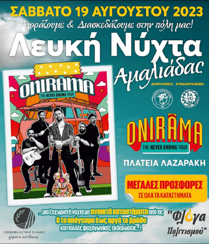 Ο Εμπορικός Σύλλογος Ήλιδας σε συνεργασία με την Περιφέρεια Δυτικής Ελλάδος και τον Δήμο Ήλιδας διοργανώνουν την «5 η Λευκή Νύχτα» στην Αμαλιάδα, το Σάββατο 19 Αυγούστου 2023. Από το απόγευμα έως τις πρώτες πρωινές ώρες, οι κεντρικοί δρόμοι της πόλης θα υποδεχθούν μια πολύχρωμη και φωτεινή γιορτή με ζωντανή μουσική και πλήθος κόσμου.