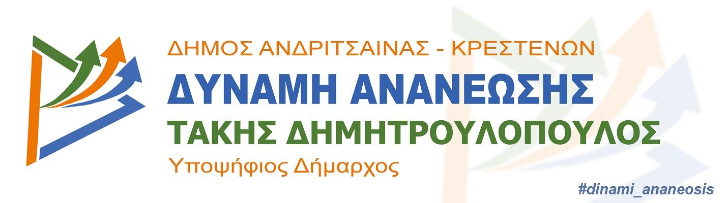 Το νέο λογότυπο της παράταξης «ΔΥΝΑΜΗ ΑΝΑΝΕΩΣΗΣ» έχει μια σύγχρονη και μοντέρνα απλοποιημένη μορφή. Το έμβλημα της παράταξής μας είναι ένα ισόπλευρο τρίγωνο που συμβολίζει την ισότητα και το ενωτικό πνεύμα στις τρείς Δημοτικές Ενότητες, ΑΛΙΦΕΙΡΑΣ, ΑΝΔΡΙΤΣΑΙΝΑΣ & ΣΚΙΛΛΟΥΝΤΟΣ, που αποτελούν το Δήμο Ανδρίτσαινας-Κρεστένων. Μέσα από το τρίγωνο πηγάζουν τρία βέλη με ανοδική φορά, τα οποία συμβολίζουν την ανάγκη για ανανέωση, για ανάπτυξη και για πρόοδο του Δήμου μας. Οι έντονες γραμματοσειρές τονίζουν τη δυναμική και τη βαρύτητα της παράταξης, ενώ η ποικιλότητα των χρωμάτων δηλώνει την πολυσυλλεκτικότητά της.