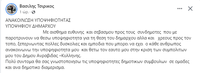 Την πρόθεσή του να διεκδικήσει τον δήμο Ανδραβίδας-Κυλλήνης, ανακοίνωσε στο facebook ο δημοτικός σύμβουλος Βασίλης Τσιρίκος.