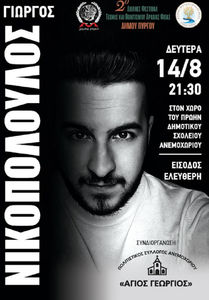 Η 10η κατά σειρά εκδήλωση του 2ου Διεθνούς Φεστιβάλ Τέχνης και Πολιτισμού Αρχαίας Φειάς, του Δήμου Πύργου είναι αφιερωμένη στο καλό λαϊκό ελληνικό τραγούδι. Την Δευτέρα 14 Αυγούστου και ώρα 21.30 στο χώρο του πρώην δημοτικού σχολείου Ανεμοχωρίου, ο Γιώργος Νικολόπουλος παίρνει τη σκυτάλη για να “ενώσει” πολλές δεκαετίες του λαϊκού πενταγράμμου με ένα πλούσιο πρόγραμμα. Η είσοδος είναι ελεύθερη για το κοινό.