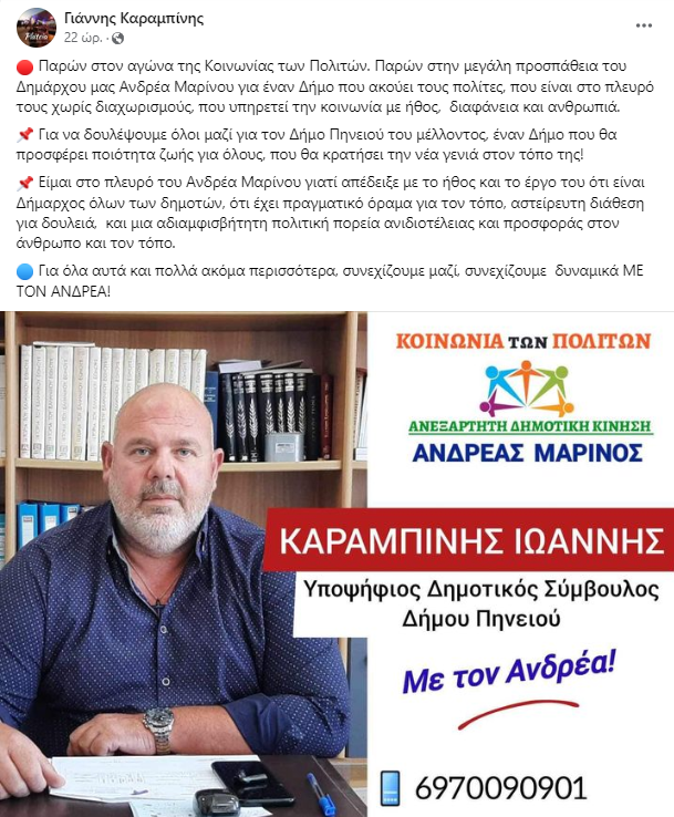 Με μία δήλωσή του, στην προσωπική του σελίδα στο facebook, ο αντιδήμαρχος Δήμου Πηνειού Γιάννης Καραμπίνης ξεκαθαρίζει ότι και σε αυτές τις δημοτικές εκλογές στηρίζει τον Ανδρέα Μαρίνο.