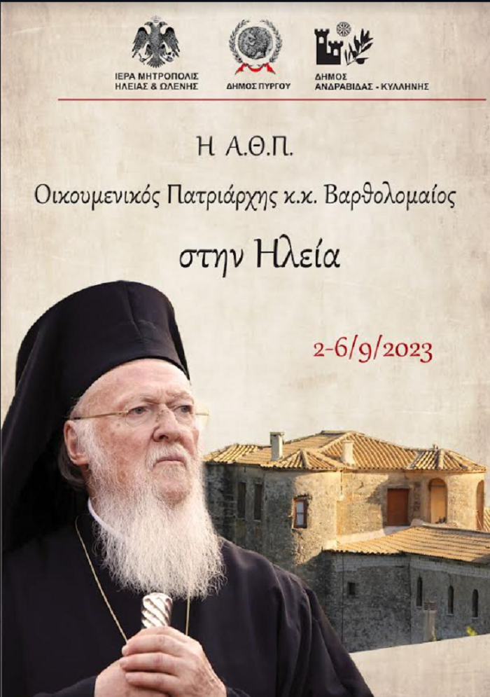 – Η επίσκεψη του Οικουμενικού Πατριάρχη πραγματοποιείται κατόπιν επίσημης κοινής πρόσκλησης της Ι.Μ. Ηλείας και των δύο Δήμων, με αφορμή την Ημερίδα με τίτλο «Η κοινή αειφόρος συνθήκη στο φυσικό και αστικό περιβάλλον – Εκφάνσεις του πολιτιστικού και περιβαλλοντικού αποτυπώματος του Οικουμενικού Πατριαρχείου» που θα διεξαχθεί στο Συνεδριακό Κέντρο της Π.Ε Ηλείας στις 4/9. Η ημερίδα διοργανώνεται από το Δήμο Πύργου, το Δήμο Ανδραβίδας Κυλλήνης, σε συνεργασία με το Πατριαρχικό Ίδρυμα Πατερικών Μελετών, την Ι.Μ. Ηλείας και το Οικουμενικό Πατριαρχείο.
