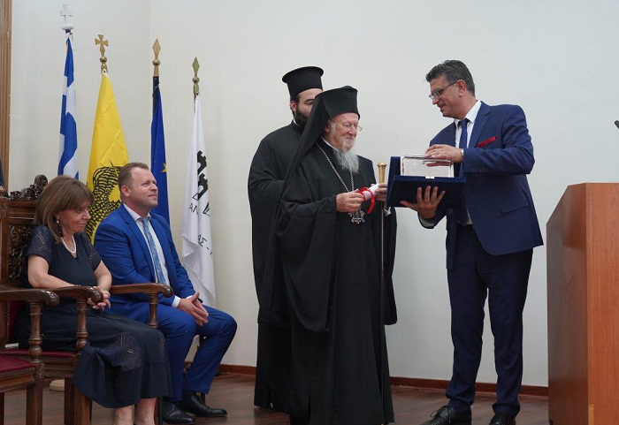 Μιλώντας για τον Οικουμενικό Πατριάρχη Βαρθολομαίο, η Κατερίνα Σακελλαροπούλου σημείωσε, απευθυνόμενη προς τον δήμαρχο, ότι «είναι μεγάλη τιμή για μένα να με συμπεριλάβετε στους δημότες σας και μάλιστα από κοινού με τον Οικουμενικό Πατριάρχη Βαρθολομαίο, μια λαμπρή προσωπικότητα που έχει κερδίσει τον σεβασμό όχι μόνο των συμπατριωτών μας, αλλά ολόκληρου του κόσμου».