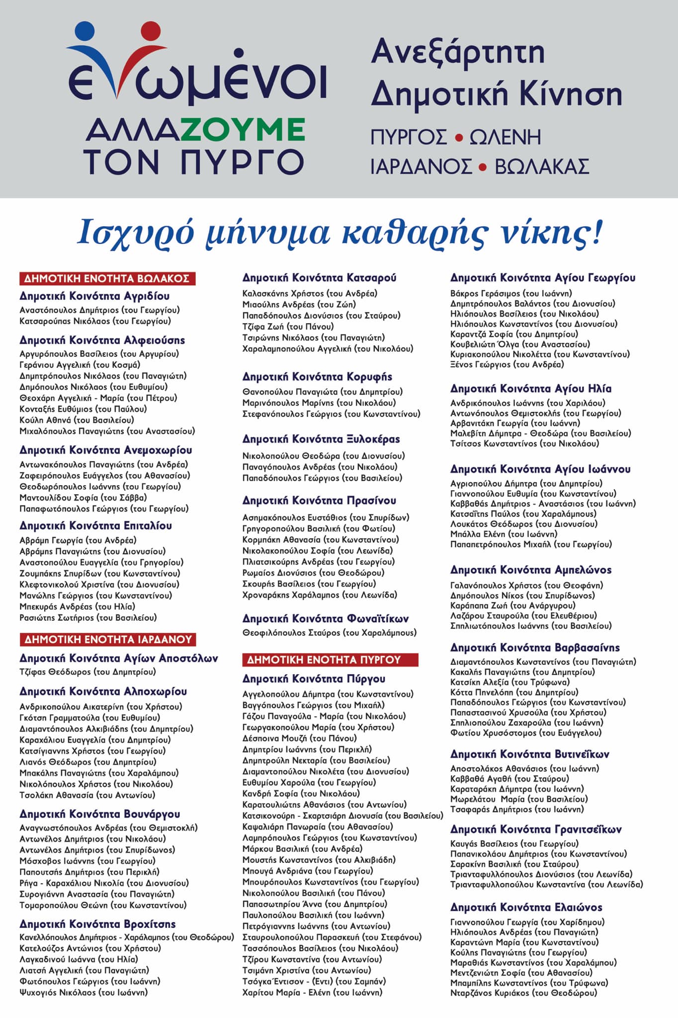 Ο δήμαρχος Πύργου, Παναγιώτης Αντωνακόπουλος, ανακοίνωσε την λίστα με τους υποψήφιους δημοτικούς συμβούλους και τους υποψήφιους τοπικών συμβουλίων.