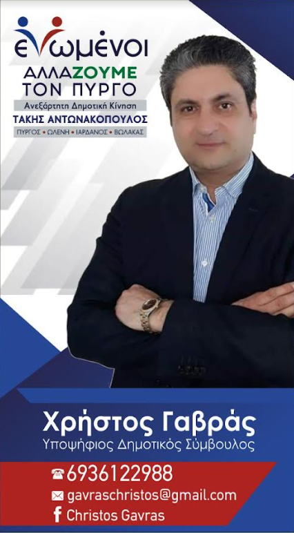 Με τον Τάκη Αντωνακόπουλο και την παράταξη “Ενωμένοι αλλάζουμε τον Πύργο”, διεκδικεί την ψήφο των πολιτών του δήμου Πύργου και ο πρώην Πρόεδρος της ΔΕΕΠ Ηλείας Χρήστος Γαβράς, η υποψηφιότητα του οποίου σηματοδοτεί την ανεξάρτητη δημοτική κίνηση του Δημάρχου Πύργου.