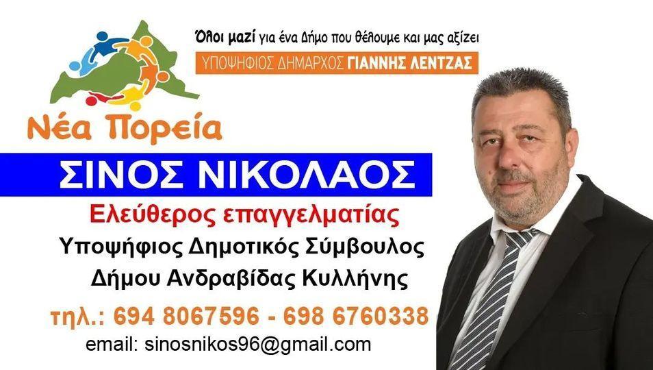 Από τους στενούς συνεργάτες του δημάρχου Ανδραβίδας-Κυλλήνης Γιάννη Λέντζα είναι ο Νίκος Σίνος.