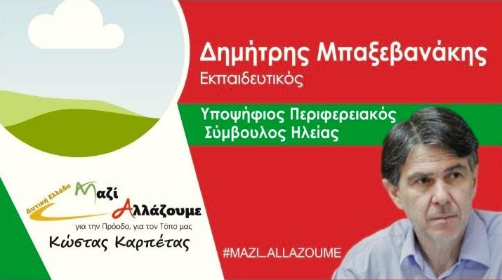 Απευθύνομαι σε όλους τους πολίτες της Ηλείας για να τους ενημερώσω ότι είμαι υποψήφιος περιφερειακός σύμβουλος με το συνδυασμό «Δυτική Ελλάδα – Μαζί αλλάζουμε», με υποψήφιο Περιφερειάρχη τον Κώστα Καρπέτα. Γιατί; Γιατί δεν γίνεται να υποστούμε για άλλη μια θητεία μια περιφερειακή αρχή που παρακολουθεί άφωνη τη δραματική απαξίωση της Ηλείας από το καθεστώς Μητσοτάκη.