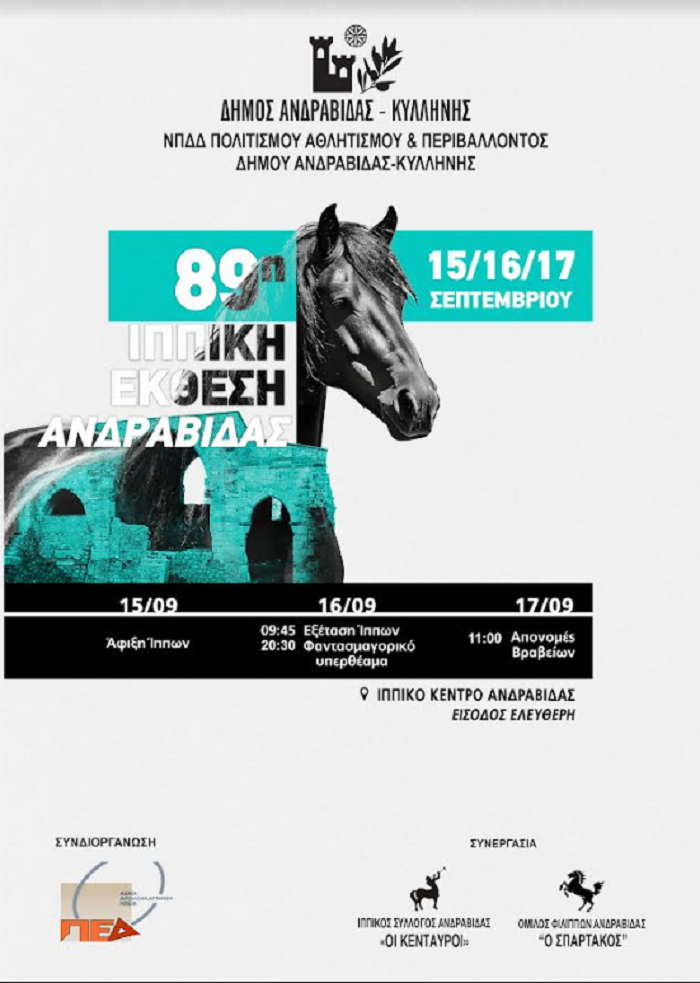 Υπό την αιγίδα του Δήμου Ανδραβίδας-Κυλλήνης και του ΝΠΔΔ Πολιτισμού, Αθλητισμού και Περιβάλλοντος, με συνδιοργάνωση της ΠΕΔ και με την συνεργασία από τον Όμιλο Φιλίππων Ανδραβίδας «Σπάρτακος» και τον Ιππικό Σύλλογο «Κένταυροι» Ανδραβίδας, η Ιππική Έκθεση Ανδραβίδας συμπληρώνει φέτος τα 89 χρόνια ζωής και σας προσκαλεί να την τιμήσετε με την παρουσία σας! Είσοδος ελεύθερη.