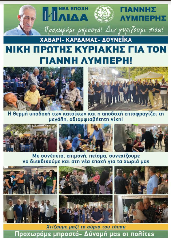 Συνεχίζει τις περιοδείες του ο δήμαρχος Ηλιδας Γιάννης Λυμπέρης, με υποψήφιους σύμβουλούς του σε κοινότητες του δήμνου Ηλιδας. Χθες επισκέφδυηκαν το Χάβαρι, τον Καρδαμά και τα Δουνέικα.
