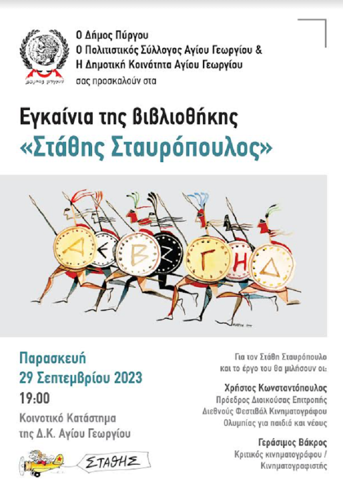 Ο Δήμος Πύργου, ο Πολιτιστικός Σύλλογος Αγίου Γεωργίου και η δημοτική κοινότητα Αγίου Γεωργίου, διοργανώνουν τα εγκαίνια της βιβλιοθήκης «Στάθης Σταυρόπουλος», την Παρασκευή 29 Σεπτεμβρίου 2023 και ώρα 19.00 στο κοινοτικό κατάστημα. Μια ιδέα που «γεννήθηκε» πριν μερικά χρόνια, παίρνει σάρκα και οστά με πρωταγωνιστή τον διακεκριμένο σκιτσογράφο, “γέννημα- θρέμμα” του Αγίου Γεωργίου.