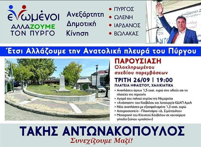 Συνεχίζοντας την προεκλογική κίνηση του καθώς και τις επισκέψεις του σε περιοχές του Πύργου και των δημοτικών κοινοτήτων, ο επικεφαλής του συνδυασμού «Ενωμένοι αλλάζουμε τον Πύργο» υποψήφιος Δήμαρχος Πύργου Τάκης Αντωνακόπουλος, την Τρίτη (26/9) θα παρευρεθεί στα Χαλικιάτικα, όπου στην πλατεία Ηφαίστου στις 19.00 θα πραγματοποιήσει παρουσίαση σχεδίου ολοκληρωμένων παρεμβάσεων στην Ανατολική πλευρά της πόλης και θα εκφωνήσει πολιτική ομιλία.