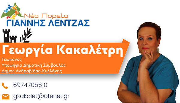 Από τους πιο στενούς συνεργάτες του δημάρχου Ανδραβίδας-Κυλλήνης, είναι η Γεωργία Κακαλέτρη, η οποία εκ νέου “έπεσε” στη “μάχη” των εκλογών της 8ης Οκτωβρίου δίνοντας νέα ώθηση στη “Νέα Πορεία”.